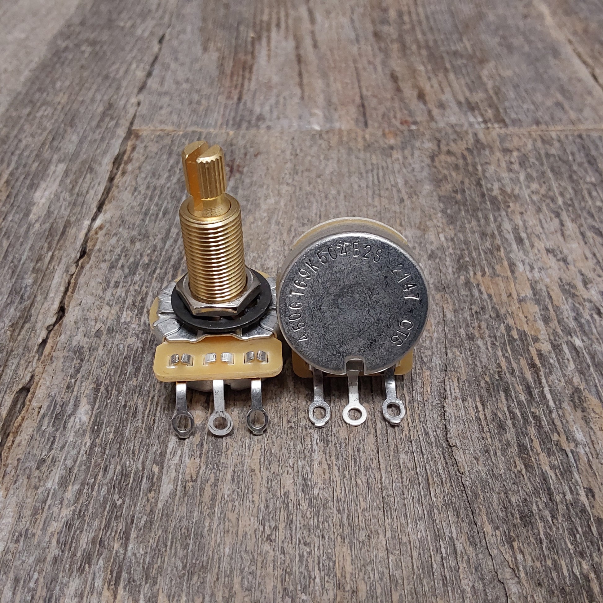 CTS potentiometers are the standard for quality in guitars. Short shaft potentiometers are used for through pickguard applications and the thinner side of a carved top guitar. We carry values of 250k and 500k ohms. Generally 500k is used for volume and tone on Humbucker equipped guitars, and the 250k for volume or tone for single coil equipped guitars, though there are certainly exceptions to these guidelines.