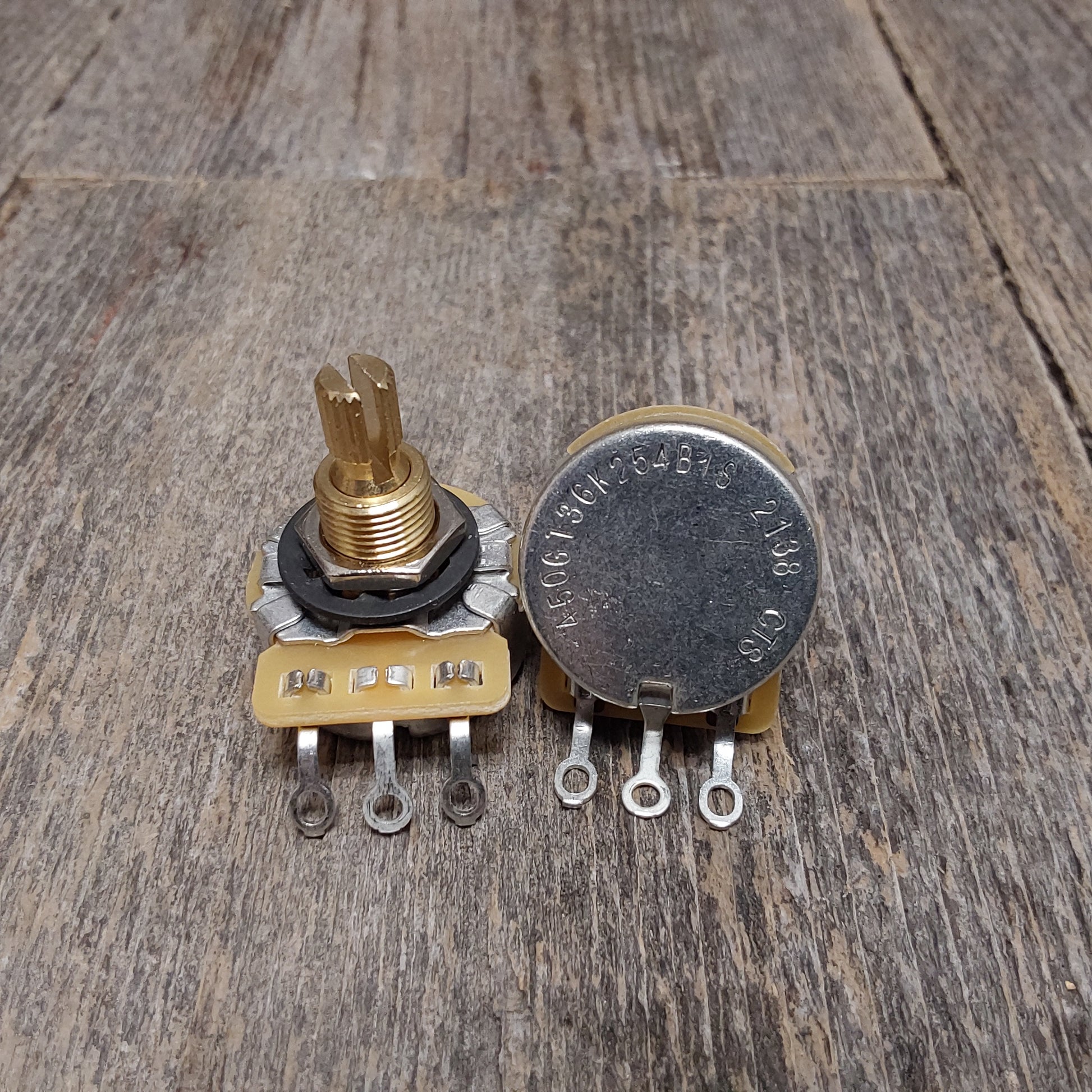 CTS potentiometers are the standard for quality in guitars. Short shaft potentiometers are used for through pickguard applications and the thinner side of a carved top guitar. We carry values of 250k and 500k ohms. Generally 500k is used for volume and tone on Humbucker equipped guitars, and the 250k for volume or tone for single coil equipped guitars, though there are certainly exceptions to these guidelines.